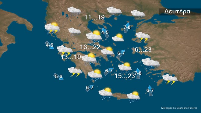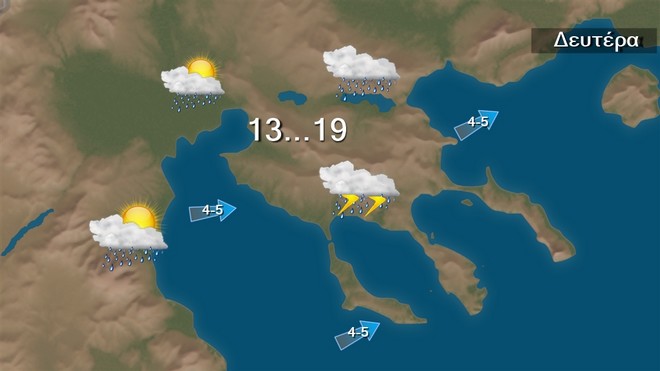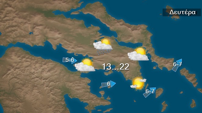Τη Δευτέρα προβλέπονται νεφώσεις παροδικά αυξημένες με τοπικές βροχές και σποραδικές καταιγίδες πιθανώς κατά τόπους ισχυρές κυρίως στα δυτικά, τα βόρεια και την ανατολική νησιωτική χώρα. Σταδιακή ύφεση των φαινομένων από το απόγευμα στα δυτικά και τα βόρεια.
