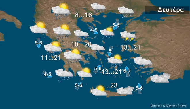 Τη Δευτέρα στα βορειοανατολικά προβλέπονται τοπικές βροχές και σποραδικές καταιγίδες τις πρωινές ώρες. Στην υπόλοιπη χώρα θα εκδηλωθούν ασθενείς τοπικές βροχές και τις μεσημβρινές και απογευματινές ώρες πρόσκαιροι όμβροι κυρίως στα ηπειρωτικά ορεινά.