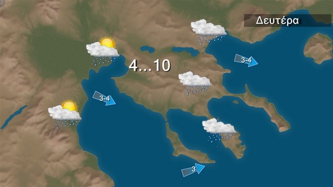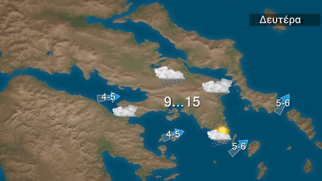 Τη Δευτέρα προβλέπονται νεφώσεις με τοπικές βροχές στις περισσότερες περιοχές της χώρας , ενώ μεμονωμένες καταιγίδες θα εκδηλωθούν κυρίως στα δυτικά, τη Θράκη, τα νησιά του ανατολικού Αιγαίου και στις Κυκλάδες. Από το απόγευμα και από τα βορειοδυτικά ο καιρός θα παρουσιάσει βελτίωση. Οι άνεμοι θα πνέουν στα δυτικά νοτιοδυτικοί 4 με 6, στρεφόμενοι γρήγορα σε δυτικούς βορειοδυτικούς 3 με 5 μποφόρ. Στα ανατολικά αρχικά θα πνέουν νότιοι νοτιοδυτικοί 4 με 5 και στο Αιγαίο τοπικά 6 μποφόρ, που από το απόγευμα και από τα βόρεια θα γίνουν δυτικοί βορειοδυτικοί 3 με 5 μποφόρ. Η θερμοκρασία θα σημειώσει άνοδο ως προς τις ελάχιστες τιμές, ενώ το μεσημέρι ο υδράργυρος θα φτάσει τους 12 βαθμούς στα βόρεια, στα υπόλοιπα ηπειρωτικά και το Ιόνιο τους 15 με 16 βαθμούς και στο Αιγαίο τους 17 βαθμούς Κελσίου.