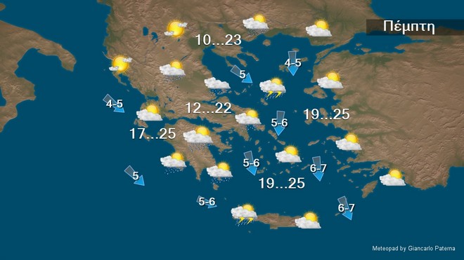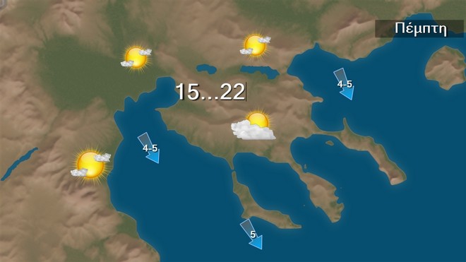 Την Πέμπτη στα Δωδεκάνησα και τη βορειοδυτική χώρα προβλέπεται γενικά αίθριος καιρός με πρόσκαιρες νεφώσεις. Στην υπόλοιπη χώρα θα υπάρχουν παροδικά αυξημένες νεφώσεις, με τοπικές βροχές και σποραδικές καταιγίδες κυρίως στα ανατολικά και τα νότια. Τα φαινόμενα, τις πρώτες πρωινές ώρες πιθανώς να είναι κατά τόπους έντονα στην ανατολική Θεσσαλία, τις Σποράδες, την ανατολική Στερεά και την Εύβοια σταδιακά θα εξασθενήσουν και το βράδυ θα περιοριστούν στην ανατολική Πελοπόννησο, τις Κυκλάδες και την Κρήτη. Οι άνεμοι θα πνέουν από βόρειες διευθύνσεις 4 με 6 και στο νοτιοανατολικό Αιγαίο πρόσκαιρα έως 7 μποφόρ.