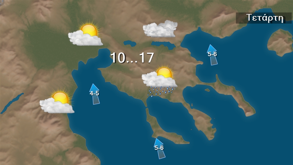 Την Τετάρτη στα δυτικά, τα βόρεια και την ανατολική νησιωτική χώρα προβλέπονται νεφώσεις με τοπικές βροχές και στα δυτικά και πιθανώς στα βόρεια σποραδικές καταιγίδες. Στα υπόλοιπα λίγες νεφώσεις παροδικά αυξημένες με πιθανότητα ασθενών βροχών. Ευνοείται η μεταφορά σκόνης. Οι άνεμοι θα πνέουν νότιοι νοτιοδυτικοί 5 με 7 και στο Αιγαίο τοπικά 8 και στα κεντρικά και βόρεια έως 9 μποφόρ. Η θερμοκρασία θα διατηρηθεί σε υψηλά για την εποχή επίπεδα και θα φτάσει στα βόρεια τους 16 με 18 βαθμούς και στην υπόλοιπη χώρα τους 18 με 19 και κατά τόπους τους 21 βαθμούς Κελσίου.