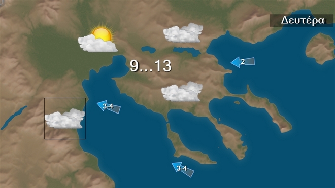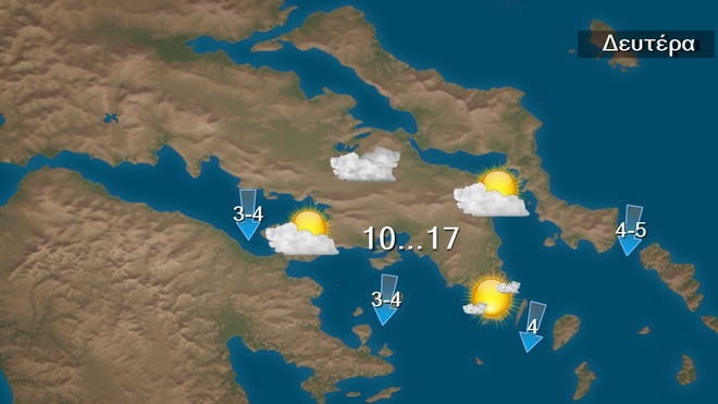 Τη Δευτέρα στα δυτικά και τα βόρεια προβλέπονται νεφώσεις με τοπικές βροχές και στα δυτικά, κυρίως στα θαλάσσια και παραθαλάσσια, σποραδικές καταιγίδες. Στην υπόλοιπη χώρα θα υπάρχουν λίγες νεφώσεις παροδικά αυξημένες..Η ορατότητα θα είναι τοπικά περιορισμένη κυρίως τις πρωινές και βραδινές ώρες στα ηπειρωτικά. Οι άνεμοι θα πνέουν στα δυτικά νότιοι νοτιοανατολικοί 4 με 5 και στο Ιόνιο τοπικά 6 μποφόρ και στα ανατολικά από βόρειες διευθύνσεις 3 με 5 και στο Αιγαίο τοπικά 6 μποφόρ. Η θερμοκρασία θα διατηρηθεί πάνω από τα κανονικά επίπεδα και θα φτάσει στα βόρεια τους 12 με 15 βαθμούς, στα υπόλοιπα ηπειρωτικά τους 16 με18 βαθμούς και στη νότια νησιωτική χώρα τους 18 με 20 βαθμούς Κελσίου.