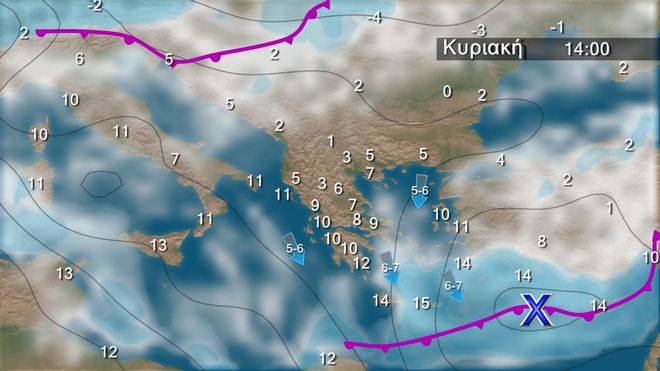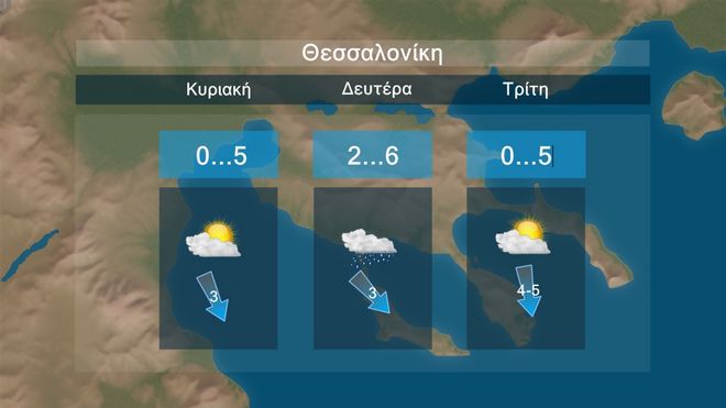 Την Κυριακή στα δυτικά και βόρεια προβλέπονται λίγες νεφώσεις. Στην υπόλοιπη χώρα προβλέπονται νεφώσεις αυξημένες στα ανατολικά και νότια με τοπικές βροχές ενώ τις πρωινές ώρες θα εκδηλωθούν πρόσκαιρες καταιγίδες στη νοτιά νησιωτική χώρα. Ασθενείς χιονοπτώσεις θα σημειωθούν στα ορεινά της ανατολικής Στερεάς, της Πελοποννήσου και της Κρήτης. Οι άνεμοι θα πνέουν από βόρειες διευθύνσεις 4 με 6 και στα πελάγη τοπικά 7 μποφόρ και πρόσκαιρα τις πρωινές ώρες στα νοτιοανατολικά από νότιες διευθύνσεις 3 με 5 μποφόρ. Η θερμοκρασία δεν θα σημειώσει αξιόλογη μεταβολή και κατά τόπους θα σημειωθεί παγετός στα κεντρικά και βόρεια ηπειρωτικά τις πρωινές και βραδινές ώρες.