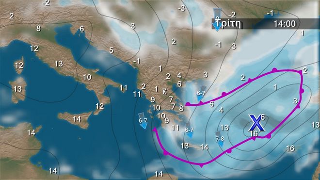 Την Τρίτη προβλέπονται βροχές και στα παραθαλάσσια καταιγίδες και στα ορεινά- ημιορεινά χιονόνερο ή χιόνι. Τα φαινόμενα θα περιοριστούν βαθμιαία στα νοτιοανατολικά. Οι άνεμοι θα πνέουν από βόρειες διευθύνσεις 6 με 7 και τοπικά στα νοτιοανατολικά 7 με 8 και η θερμοκρασία θα πέσει σε όλη τη χώρα.