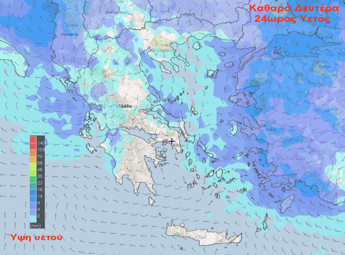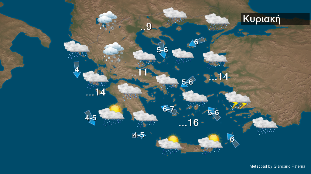 Οι άνεμοι θα πνέουν στα νοτιοανατολικά από νότιες διευθύνσεις και στην υπόλοιπη χώρα από βόρειες, με ένταση 4 με 6 και στο βόρειο Αιγαίο τοπικά 7 μποφόρ. Η θερμοκρασία δεν θα ξεπεράσει στα βόρεια τους 7 με 9 βαθμούς, ενώ θα φτάσει στην Κρήτη, τις Κυκλάδες και τα Δωδεκάνησα τους 16 με 18 και στην υπόλοιπη χώρα τους 13 με 15 βαθμούς Κελσίου. Παγετός θα σημειωθεί τις πρωινές και βραδινές ώρες κατά τόπους στα βόρεια ηπειρωτικά.