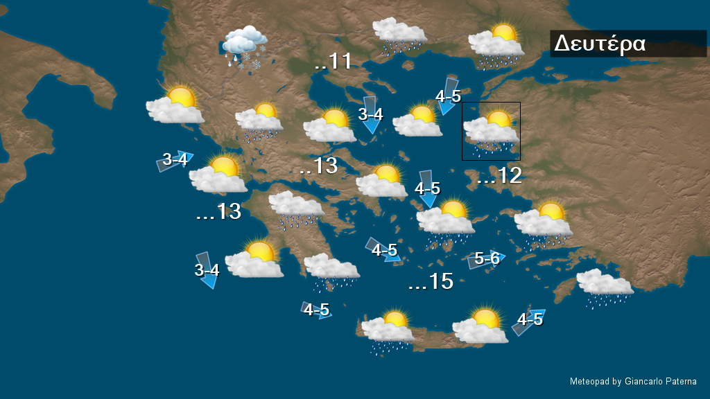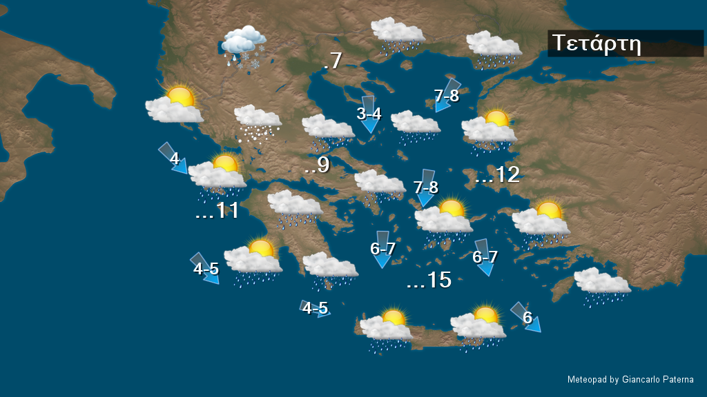 Νεφώσεις παροδικά αυξημένες κυρίως στα δυτικά, τα κεντρικά, τα βόρεια και το ανατολικό Αιγαίο, με τοπικές βροχές και κυρίως στα θαλάσσια και παραθαλάσσια τμήματα σποραδικές καταιγίδες. Τα φαινόμενα τις βραδινές ώρες στα βόρεια θα ενταθούν. Χιονοπτώσεις θα σημειωθούν στα ηπειρωτικά ορεινά καθώς και στα βόρεια ημιορεινά. Οι άνεμοι θα πνέουν στα δυτικά και τα νότια δυτικοί βορειοδυτικοί και στην υπόλοιπη χώρα βόρειοι βορειοανατολικοί, με ένταση 4 με 5 και βαθμιαία τοπικά 6 μποφόρ. Η θερμοκρασία θα σημειώσει μικρή πτώση κυρίως στα κεντρικά και βόρεια. Παγετός θα σημειωθεί τις πρωινές και βραδινές ώρες κατά τόπους στα ηπειρωτικά.