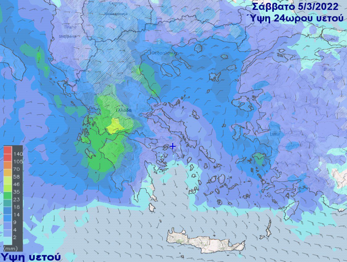 Σήμερα Σάββατο προβλέπονται τοπικές βροχές και σποραδικές καταιγίδες κυρίως στα θαλάσσια παραθαλάσσια και χιονοπτώσεις στα κεντρικά και βόρεια ορεινά. Τα φαινόμενα στη δυτική και βόρεια χώρα θα είναι κατά τόπους έντονα. Οι μετεωρολογικές συνθήκες ευνοούν τη μεταφορά αφρικανικής σκόνης στα νότια. Οι άνεμοι θα πνέουν από νότιες διευθύνσεις 3 με 5 και από τις βραδινές ώρες στο νότιο Αιγαίο τοπικά 6 μποφόρ και μόνο στα βορειοανατολικά θα πνέουν ανατολικοί βορειοανατολικοί 3 με 5 και από το απόγευμα στο βόρειο Αιγαίο 6 τοπικά 7 μποφόρ.