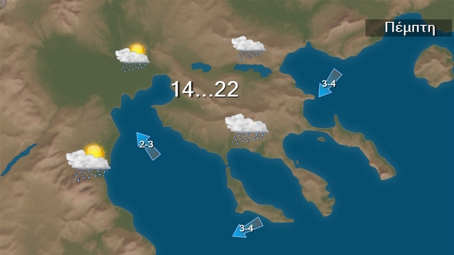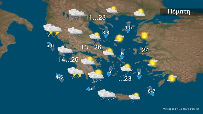 Την Πέμπτη στα δυτικά, τα κεντρικά και τα βόρεια προβλέπονται νεφώσεις που βαθμιαία θα αυξηθούν και θα σημειωθούν τοπικές βροχές. Από το απόγευμα στο Ιόνιο, την Ήπειρο και τη δυτική Στερεά θα εκδηλωθούν και καταιγίδες και από τις βραδινές ώρες τα φαινόμενα θα είναι κατά τόπους ισχυρά. Στις υπόλοιπες περιοχές θα υπάρχουν λίγες νεφώσεις οι οποίες στα ηπειρωτικά βαθμιαία θα αυξηθούν.
