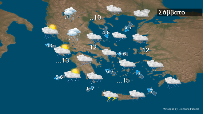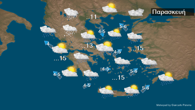 Σε όλη τη χώρα προβλέπονται νεφώσεις με τοπικές βροχές και κυρίως στα ανατολικά σποραδικές καταιγίδες πιθανώς πρόσκαιρα ισχυρές. Χιονοπτώσεις θα σημειωθούν στα ηπειρωτικά ορεινά καθώς και στα βόρεια ημιορεινά. Τα φαινόμενα από τα δυτικά βαθμιαία θα εξασθενήσουν. Οι άνεμοι θα πνέουν από βόρειες διευθύνσεις 4 με 6 και στο βόρειο Αιγαίο τοπικά 7 μποφόρ και μόνο στα νοτιοανατολικά το πρωί θα είναι νοτιοανατολικοί με την ίδια ένταση. Η θερμοκρασία θα σημειώσει περαιτέρω πτώση στα βόρεια. Παγετός θα σημειωθεί τις πρωινές και βραδινές ώρες κατά τόπους στα ηπειρωτικά.