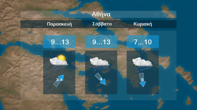 Στην Αθήνα προβλέπονται νεφώσεις τις επόμενες μέρες παροδικά αυξημένες με βροχές . Η θερμοκρασία θα έχει μέγιστες τιμές περί τους 10 με 13 βαθμούς Κελσίου
