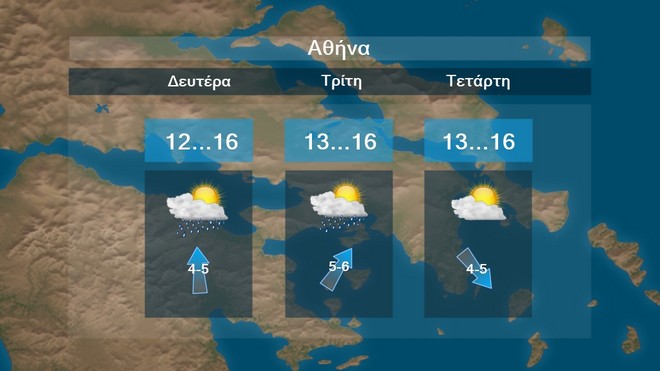 Στην Αθήνα προβλέπονται παροδικές νεφώσεις με τοπικές βροχές Δευτέρα και Τρίτη Η θερμοκρασία θα έχει μέγιστες τιμές περί τους 16 βαθμούς Κελσίου