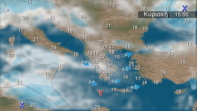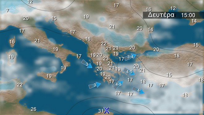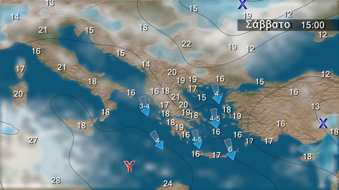 ώρες βορειοδυτικοί 4 με 5 μποφόρ. Η θερμοκρασία δεν θα σημειώσει αξιόλογη μεταβολή.