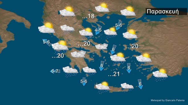 Στην ανατολική Μακεδονία, τη Θράκη, τα νησιά του ανατολικού Αιγαίου και τα Δωδεκάνησα προβλέπονται λίγες νεφώσεις παροδικά αυξημένες. Στην υπόλοιπη χώρα προβλέπονται νεφώσεις με τοπικές βροχές. Σποραδικές καταιγίδες θα εκδηλωθούν στο νότιο Ιόνιο, τη νότια Πελοπόννησο και τη δυτική Κρήτη. Χιόνια θα πέσουν στα κεντρικά και βόρεια ορεινά. Από το απόγευμα βαθμιαία τα φαινόμενα θα εξασθενίσουν. Οι άνεμοι θα πνέουν στα δυτικά ανατολικοί νοτιοανατολικοί 5 με 7 και στο Ιόνιο τοπικά 8 μποφόρ. Στα ανατολικά θα πνέουν βόρειοι βορειοανατολικοί 4 με 6 και πρόσκαιρα στο Αιγαίο τις πρωινές ώρες τοπικά 7 μποφόρ. Η θερμοκρασία δεν θα σημειώσει αξιόλογη μεταβολή. Στα βόρεια δεν θα ξεπεράσει τους 13 με 16 βαθμούς Κελσίου, στην υπόλοιπη χώρα θα φτάσει τους 17 με 20 και στα Δωδεκάνησα και την Κρήτη τους 19 με 22 βαθμούς Κελσίου.