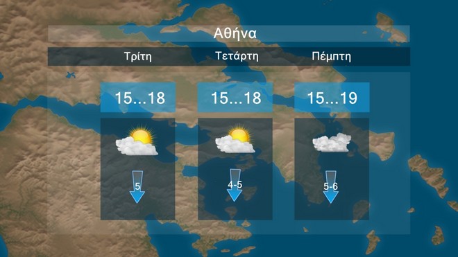 Στα δυτικά προβλέπονται νεφώσεις με βροχές και σποραδικές καταιγίδες που το βράδυ στα βορειοδυτικά θα εξασθενήσουν. Στην υπόλοιπη χώρα προβλέπονται λίγες νεφώσεις παροδικά αυξημένες με τοπικές βροχές και πιθανόν μεμονωμένες καταιγίδες κυρίως στη Χαλκιδική, τη Θεσσαλία, τις Σποράδες, τη βόρεια Εύβοια, την ανατολική Στερεά, την ανατολική Πελοπόννησο και την Κρήτη. Οι άνεμοι θα πνέουν στα δυτικά ανατολικοί νοτιοανατολικοί 4 με 6 και στο Ιόνιο τοπικά 7 μποφόρ. Στα ανατολικά θα πνέουν βόρειοι βορειοανατολικοί 3 με 5 μποφόρ και στο Αιγαίο τοπικά 6 μποφόρ με βαθμιαία ενίσχυση από το βράδυ. Η θερμοκρασία θα σημειώσει μικρή περαιτέρω άνοδο κυρίως στα ανατολικά.
