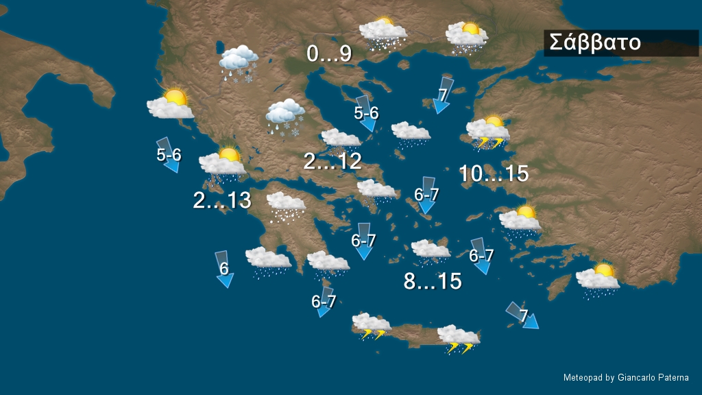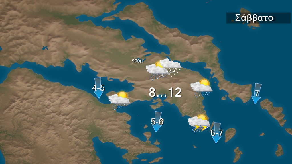 Το Σάββατο προβλέπονται νεφώσεις παροδικά αυξημένες με τοπικές βροχές ή χιονόνερο και κυρίως στα νότια θαλάσσια και παραθαλάσσια τμήματα, ενώ σποραδικές καταιγίδες θα εκδηλωθούν οι οποίες από το βράδυ στη νότια Πελοπόννησο και την Κρήτη θα είναι κατά τόπους ισχυρές. Χιόνια θα πέσουν στα ορεινά και ημιορεινά της κεντρικής και βόρειας χώρας και πρόσκαιρα σε περιοχές με χαμηλό υψόμετρο στη Μακεδονία και τη Θράκη. Οι άνεμοι θα πνέουν από βόρειες διευθύνσεις 4 με 6 μποφόρ και από το βράδυ στο βόρειο Αιγαίο τοπικά 7 με 8 μποφόρ. Η θερμοκρασία θα παρουσιάσει πτώση κυρίως στα ανατολικά. Στα βόρεια ο υδράργυρος δεν θα ξεπεράσει τους 9 βαθμούς , στα υπόλοιπα ηπειρωτικά και το Ιόνιο θα φτάσει τους 12 με 13 βαθμούς και στο Αιγαίο τους 15 βαθμούς Κελσίου.