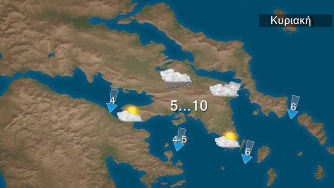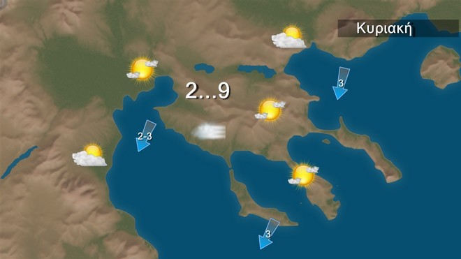 Την Κυριακή προβλέπονται νεφώσεις παροδικά αυξημένες με ασθενείς τοπικές βροχές και στα ορεινά ασθενείς χιονοπτώσεις. Τοπικά περιορισμένη ορατότητα ή ομίχλες τις πρωινές και βραδινές ώρες στα ηπειρωτικά. Οι άνεμοι στα ανατολικά θα πνέουν από βόρειες διευθύνσεις, τοπικά στο Αιγαίο 6 μποφόρ. Η θερμοκρασία θα σημειώσει πτώση στα ανατολικά και τα βόρεια και παγετός θα σημειωθεί κατά τόπους στα ηπειρωτικά τις πρωινές και τις βραδινές ώρες. Η θερμοκρασία το μεσημέρι δεν θα ξεπεράσει στα βόρεια τους 9 βαθμούς Κελσίου, στα υπόλοιπα ηπειρωτικά και το Ιόνιο θα φτάσει τους 112 με 14 βαθμούς και στο Αιγαίο τους 13 με 14 βαθμούς Κελσίου.