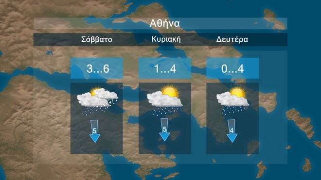 Στην Αθήνα προβλέπονται νεφώσεις παροδικά αυξημένες με βροχές ή χιονόνερο και χιόνια στα ορεινά του νομού Η μέγιστη θερμοκρασία μεταξύ 4 και 6 βαθμών κελσίου