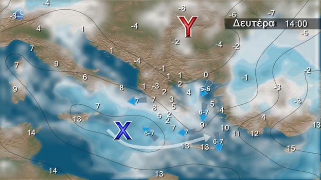 Στη Θράκη, τα νησιά του ανατολικού Αιγαίου και τα Δωδεκάνησα λίγες νεφώσεις που γρήγορα θα αυξηθούν και θα σημειωθούν τοπικές βροχές ή χιονόνερο και στα θαλάσσια – παραθαλάσσια σποραδικές καταιγίδες, ενώ στα βορειοανατολικά θα σημειωθούν πρόσκαιρες χιονοπτώσεις ακόμα και σε πεδινές περιοχές. Στην υπόλοιπη χώρα βροχές ή χιονόνερο κυρίως στα ανατολικά και τα νότια,. Χιονοπτώσεις θα σημειωθούν στα ορεινά-ημιορεινά κυρίως της ανατολικής ηπειρωτικής χώρας, όπου κατά διαστήματα θα είναι πυκνές, ενώ θα χιονίσει και σε περιοχές της ανατολικής Θεσσαλίας, της κεντρικής και ανατολικής Στερεάς, της Εύβοιας και της βόρειας Πελοποννήσου με χαμηλό υψόμετρο. Βαθμιαία στα βορειοδυτικά τα φαινόμενα θα σταματήσουν. Οι άνεμοι θα πνέουν βόρειοι βορειοανατολικοί 4 με 6 και στα πελάγη βαθμιαία τοπικά 7 μποφόρ. Η θερμοκρασία θα κυμανθεί σε χαμηλά επίπεδα και θα σημειωθεί παγετός στα ηπειρωτικά τις πρωινές και βραδινές ώρες, κατά τόπους ισχυρός στα κεντρικά και τα βόρεια.