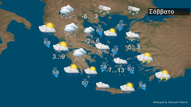 Στην Ήπειρο, τη Μακεδονία και τη Θράκη σχεδόν αίθριος καιρός. Στην υπόλοιπη χώρα προβλέπονται νεφώσεις με τοπικές βροχές ή χιονόνερο ενώ χιονοπτώσεις θα σημειωθούν κυρίως στα ορεινά και ημιορεινά. Από το μεσημέρι και από τα νοτιοδυτικά, προβλέπεται εκ νέου επιδείνωση του καιρού η οποία θα επηρεάσει την κεντρική και νότια χώρα με τοπικές βροχές και σποραδικές καταιγίδες κυρίως στα θαλάσσια και παραθαλάσσια τμήματα. Τα φαινόμενα πιθανώς να είναι κατά τόπους έντονα στο νότιο Ιόνιο, την Πελοπόννησο και την Κρήτη. Χιονοπτώσεις, πρόσκαιρα πυκνές θα σημειωθούν στα ορεινά και στα ημιορεινά κυρίως της Πελοποννήσου. Οι άνεμοι θα πνέουν στα δυτικά δυτικοί βορειοδυτικοί 3 με 5 μποφόρ που γρήγορα θα στραφούν σε ανατολικούς και θα ενισχυθούν στα 5 με 7 μποφόρ. Στα ανατολικά βόρειοι βορειοδυτικοί 4 με 6 μποφόρ με σταδιακή εξασθένηση. Η θερμοκρασία θα διατηρηθεί σε χαμηλά επίπεδα. Παγετός θα σημειωθεί στα ηπειρωτικά τις πρωινές και βραδινές ώρες, κατά τόπους ισχυρός στα κεντρικά και τα βόρεια.