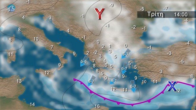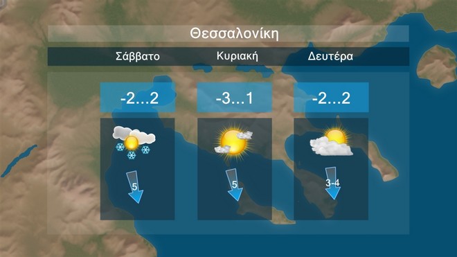 Στα βορειοδυτικά προβλέπονται παροδικές νεφώσεις. Στην υπόλοιπη χώρα βροχές ή χιονόνερο και στο Αιγαίο μεμονωμένες καταιγίδες. Τοπικές χιονοπτώσεις θα σημειωθούν στα ανατολικά και κυρίως, στα προσήνεμα της ανατολικής ηπειρωτικής χώρας, στην Εύβοια και τα νησιά του βορείου και ανατολικού Αιγαίου όπου θα χιονίζει κατά διαστήματα και σε πεδινές περιοχές. Οι άνεμοι θα πνέουν από βόρειες διευθύνσεις 5 με 7 και στα πελάγη τοπικά 8 μποφόρ, με μικρή εξασθένηση το βράδυ στα δυτικά. Η θερμοκρασία θα σημειώσει μικρή περαιτέρω πτώση κυρίως στα ανατολικά και τα νότια. Παγετός θα σημειωθεί στα ηπειρωτικά τις πρωινές και βραδινές ώρες, ο οποίος θα είναι κατά τόπους ισχυρός στα κεντρικά και τα βόρεια ενώ σε περιοχές της Μακεδονίας και της Θράκης θα είναι ολικός.