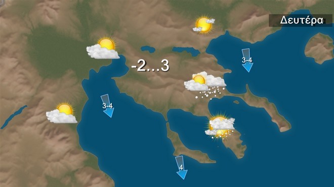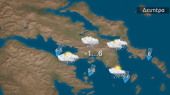 Τη Δευτέρα αρχικά θα επικρατήσει κακοκαιρία στις νότιες κυρίως περιοχές με χιονοπτώσεις ακόμα και στα πεδινά και ισχυρές βροχές και καταιγίδες στα νότια . Οι άνεμοι θα πνέουν ανατολικοί βορειανατολικοί 4 με 6 και στα νότια πελάγη τοπικά 7 με 8 μποφόρ, οι οποίοι το βράδυ θα στραφούν σε βόρειους. Η θερμοκρασία θα κυμανθεί σε χαμηλά επίπεδα και παγετός θα σημειωθεί κυρίως στα ηπειρωτικά τις πρωινές και βραδινές ώρες, στα κεντρικά και τα βόρεια κατά τόπους ισχυρός και στη Μακεδονία κατά τόπους ολικός Η θερμοκρασία θα έχει μέγιστη τιμή στα βόρεια τους 4 βαθμούς, στα υπόλοιπα ηπειρωτικά και το Ιόνιο τους 6 με 9 βαθμούς Κελσίου, στις Κυκλάδες και την Κρήτη τους 9 βαθμούς και στο Ανατολικό Αιγαίο και τα Δωδεκάνησα τους 10 βαθμούς Κελσίου.