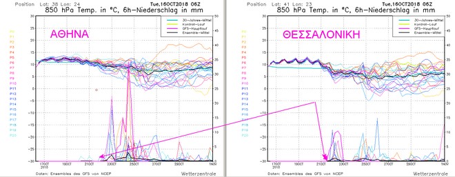 Υπάρχει σαφής τάση για πτώση της θερμοκρασίας στην Αθήνα και στη Θεσσαλονίκη της τάξεως των 5 περίπου βαθμών. Παράλληλα διαφαίνεται και η προοπτική για αξιόλογες βροχοπτώσεις και στις δύο περιοχές.