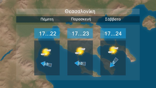 Στη Θεσσαλονίκη προβλέπεται σχεδόν αίθριος καιρός. Οι άνεμοι θα πνέουν μεταβλητοί 3 μποφόρ. Η θερμοκρασία θα φτάσει τους 25 βαθμούς.