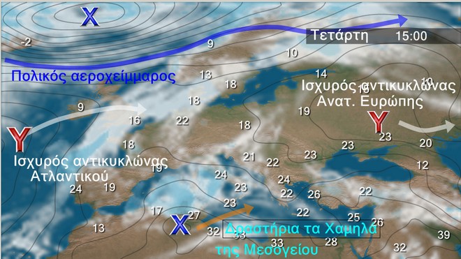Πληροφορούμαστε επίσης ότι τα δραστήρια χαμηλά που αυτήν την εποχή σχηματίζονται στην Μεσόγειο δεν πρόκειται άμεσα να μας επηρεάσουν, καθώς εμποδίζονται από τον ισχυρό αντικυκλώνα της Ανατολικής Ευρώπης, ενώ παράλληλα βλέπουμε ότι υπάρχει τάση να κινηθεί ανατολικότερα ένας άλλος ισχυρός αντικυκλώνας αυτός του Ατλαντικού Ωκεανού από την περιοχή των Αζορών.