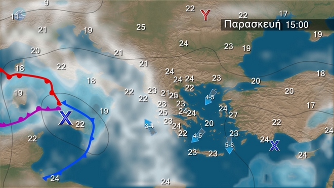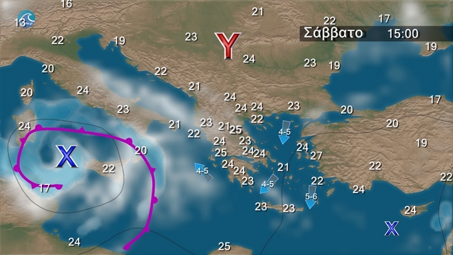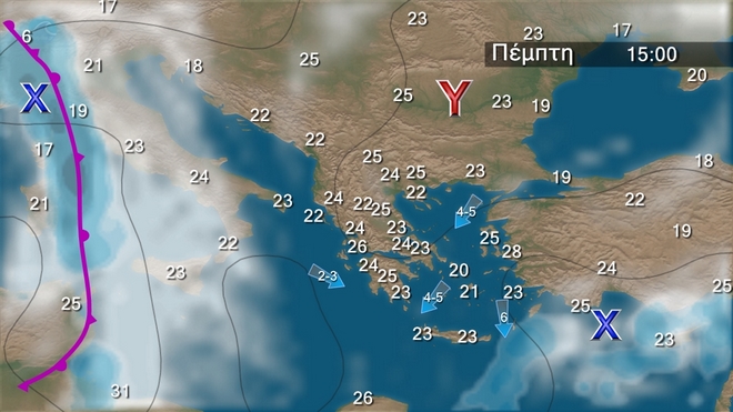 Οι άνεμοι, στα δυτικά μεταβλητοί ασθενείς, στα ανατολικά από βόρειες διευθύνσεις 3 με 5 και στο Αιγαίο τοπικά 6 μποφόρ.