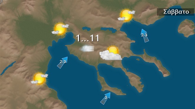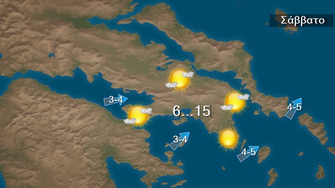 Το Σάββατο σε όλη τη χώρα προβλέπεται ήπιος καιρός, με ηλιοφάνεια στις περισσότερες περιοχές και με τοπικές βροχές κυρίως στα δυτικά. Η ορατότητα τις πρωινές ώρες θα είναι τοπικά περιορισμένη. Οι άνεμοι θα πνέουν νοτιοδυτικοί 4 με 5 και στα πελάγη τοπικά 6 μποφόρ. Η θερμοκρασία θα παρουσιάσει μικρή άνοδο και οι μέγιστες τιμές της θα φτάσουν στα βόρεια ηπειρωτικά τους 12 βαθμούς, στα υπόλοιπα ηπειρωτικά τους 14 με 15 και στη νότια νησιωτική χώρα τους 16 με 17 βαθμούς Κελσίου. Τις πρωινές ώρες στα βόρεια ηπειρωτικά θα σημειωθεί κατά τόπους παγετός.