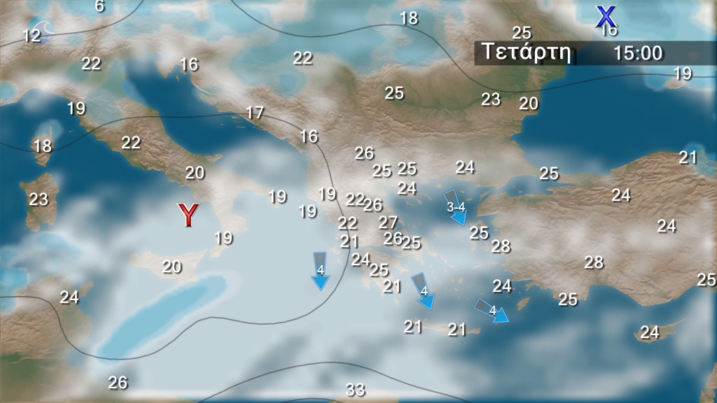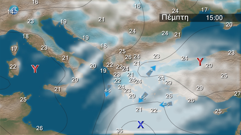 Αραιές νεφώσεις κατά διαστήματα πιο πυκνές, αρχικά στα κεντρικά και τα νότια όπου θα σημειωθούν τοπικές βροχές. Από το απόγευμα τοπικοί όμβροι και σποραδικές καταιγίδες θα εκδηλωθούν στα ηπειρωτικά, κυρίως στα κεντρικά και βόρεια. Οι άνεμοι θα πνέουν στα δυτικά, κεντρικά και βόρεια από βόρειες διευθύνσεις 3 με 5 μποφόρ και στα υπόλοιπα από ανατολικές διευθύνσεις με την ίδια ένταση. Η θερμοκρασία δε θα σημειώσει αξιόλογη μεταβολή.