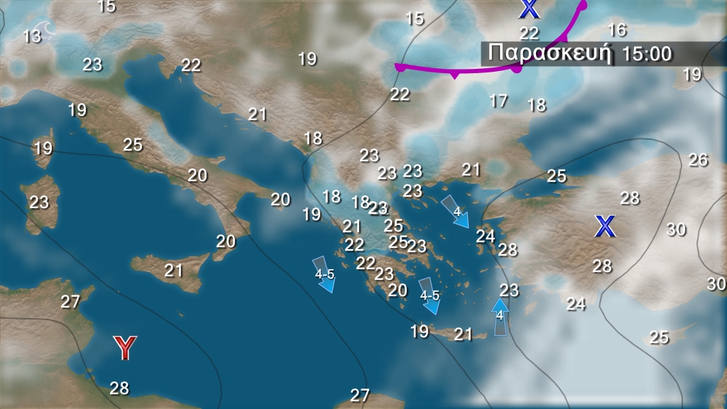 Γενικά αίθριος καιρός. Τις μεσημβρινές και απογευματινές ώρες στα ηπειρωτικά θα αναπτυχθούν τοπικές νεφώσεις και είναι πιθανό να εκδηλωθούν τοπικοί όμβροι κυρίως στα ορεινά. Οι άνεμοι θα πνέουν δυτικοί βορειοδυτικοί 3 με 5 και στα νότια έως 6 μποφόρ, που βαθμιαία από το απόγευμα του Σαββάτου στα κεντρικά και βόρεια θα στραφούν σε νότιους 3 με 4 μποφόρ. Η θερμοκρασία θα σημειώσει μικρή άνοδο το Σάββατο.