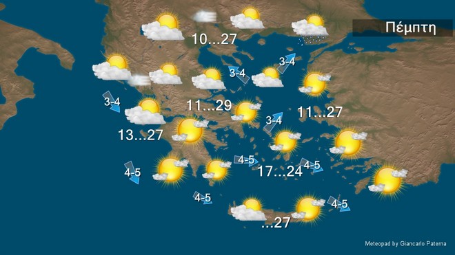 Την Πέμπτη σε όλη τη χώρα προβλέπονται αραιές νεφώσεις που από το απόγευμα θα πυκνώσουν στα βόρεια και υπάρχει πιθανότητα στη Θράκη να έχουμε παροδικές μπόρες . Οι άνεμοι θα πνέουν δυτικοί βορειοδυτικοί 3 με 5 και τοπικά στα νότια έως 6 μποφόρ. Από το απόγευμα στα βόρεια θα στραφούν οι άνεμοι σε νότιους 4 με 5 μποφόρ. Η θερμοκρασία δεν θα σημειώσει αξιόλογη μεταβολή και θα έχουμε μέγιστη τιμή στα βόρεια τους 27 βαθμούς στο Ιόνιο και τα ηπειρωτικά τους 27 με 29 στο Αιγαίο τους 24 με 27 και στη Κρήτη τοπικά 27 βαθμούς Κελσίου.