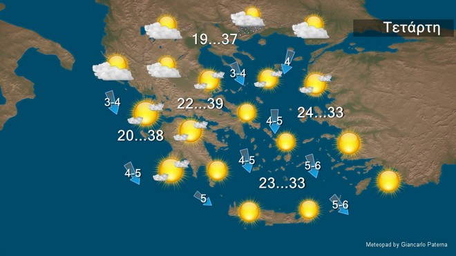Για σήμερα Τετάρτη σε όλη τη χώρα προβλέπεται γενικά αίθριος με πρόσκαιρες τοπικές νεφώσεις στα ηπειρωτικά τις μεσημβρινές και απογευματινές ώρες, οπότε είναι πιθανό να εκδηλωθούν τοπικοί όμβροι στα βορειοανατολικά. Οι άνεμοι θα πνέουν από βόρειες διευθύνσεις 3 με 5, και τοπικά στο νότιο Αιγαίο 5 με 6 μποφόρ. Η θερμοκρασία στο Ιόνιο και τα ηπειρωτικά θα φτάσει κατά τόπους τους 37 με 39 βαθμούς Κελσίου και στο Αιγαίο τους 33 βαθμούς Κελσίου.