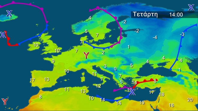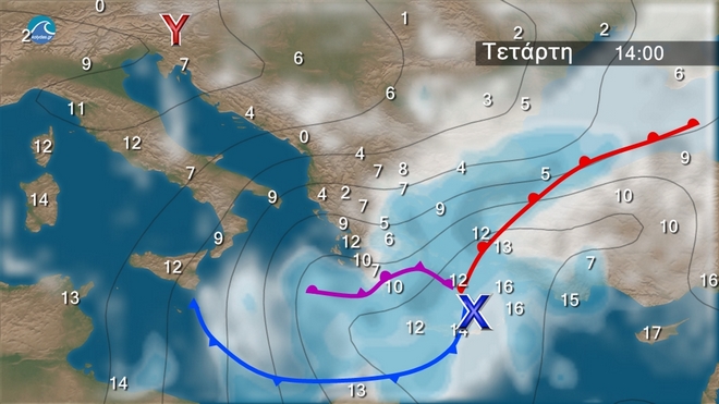 Στον χάρτη της Βαλκανικής που ακολουθεί παρατηρούμε ότι το βαρομετρικό χαμηλό που θα μας επηρεάσει βρίσκεται στο νότιο Αιγαίο και στροβιλιζόμενο θα μεταφέρει ψυχρές αέριες μάζες και η θερμοκρασία θα πέσει σημαντικά. Στα βόρεια η θερμοκρασία θα φτάσει τους 8 βαθμούς και στις υπόλοιπες περιοχές τους 10 με 12 βαθμούς Κελσίου. Οι άνεμοι θα έχουν μέγιστη ένταση τα 8 με 9 και τοπικά ακόμη και τα 10 μποφόρ.