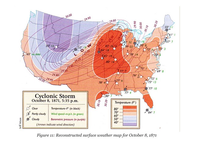 Στις 8 /10/ 1871 λόγω της παρατεταμένης ξηρασίας και των θυελλωδών νοτιοδυτικών ανέμων είχαμε καταστροφικές πυρκαγιές στις βόρειες αμερικανικές πολιτείες Ιλινόι, Ουισκόνσιν και Μίσιγκαν, καθώς και σε περιοχές των μεσοδυτικών πολιτειών. Η μία από αυτές κατέστρεψε το μεγαλύτερο μέρος του Σικάγου προκαλώντας το θάνατο 250 ανθρώπων. Σε παράλληλη πυρκαγιά που κατέκαυσε το Πέστιγκο του Ουισκόνσιν, έχασαν τη ζωή τους πάνω από χίλιοι άνθρωποι.