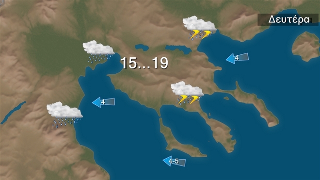 Σήμερα Δευτέρα στα νησιά του Ιονίου, την Ήπειρο, τη δυτική Στερεά, τη δυτική Πελοπόννησο, την κεντρική και ανατολική Μακεδονία, τη Θεσσαλία, τις Σποράδες και την κεντρική Στερεά προβλέπονται νεφώσεις με ισχυρές βροχές και καταιγίδες. Στα υπόλοιπα θα υπάρχουν νεφώσεις παροδικά αυξημένες, στα ηπειρωτικά θα σημειωθούν τοπικές βροχές και σποραδικές καταιγίδες μέχρι τις απογευματινές ώρες ενώ τοπικές καταιγίδες θα εκδηλωθούν και στο βόρειο Αιγαίο. Οι άνεμοι στο Ιόνιο και στο κεντρικό και νότιο Αιγαίο από νότιες διευθύνσεις 4 με 5 μποφόρ. Η θερμοκρασία θα φτάσει στα βόρεια τους 20 βαθμούς, στην Κρήτη και τα Δωδεκάνησα τους 29 βαθμούς και στις υπόλοιπες περιοχές τους 23 με 25 βαθμούς Κελσίου.
