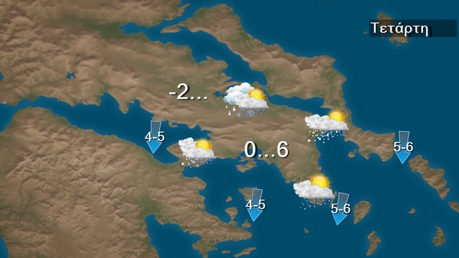 Την Τετάρτη στην ανατολική και νότια χώρα αυξημένες νεφώσεις με τοπικές βροχές ή χιονόνερο και χιονοπτώσεις στα ορεινά-ημιορεινά αλλά και σε περιοχές στα κεντρικά και βόρεια με χαμηλότερο υψόμετρο. Οι χιονοπτώσεις προβλέπεται να συνεχιστούν στην ανατολική Θεσσαλία, την Εύβοια, την ανατολική Στερεά, πρόσκαιρα στα νησιά του βορείου και ανατολικού Αιγαίου καθώς και σε ορεινές και ημιορεινές περιοχές της Ανατολικής Πελοποννήσου, των Κυκλάδων και της Κρήτης.
