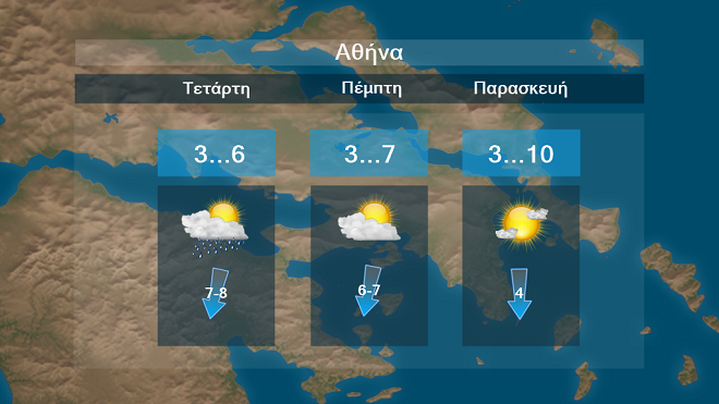 Στην Αθήνα προβλέπονται νεφώσεις με βροχές ή χιονόνερο και χιόνια στα ορεινά την Τετάρτη . Η θερμοκρασία θα έχει μέγιστες τιμές περί τους 7 με 10 βαθμούς Κελσίου.