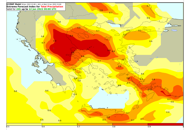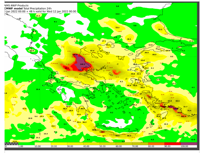 Ιδιαίτερα μεγάλα προβλέπονται τα ύψη υετού στη Θεσσαλία (πάνω από 100 mm) καθώς επίσης σε μέρος της υπόλοιπης Κεντρικής Ελλάδος και της Δωδεκανήσου. Την Τετάρτη (12-01-2022) κατά τόπους ισχυρές βροχές προβλέπονται στις Κυκλάδες, την Κρήτη και τα Δωδεκάνησα και μέχρι το μεσημέρι στη Θεσσαλία, τις Σποράδες και την Εύβοια.