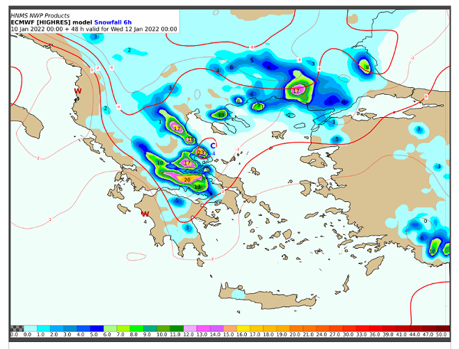 Την Τετάρτη (12-01-2022) πρόσκαιρα πυκνές χιονοπτώσεις θα σημειωθούν κατά τόπους στις προαναφερθείσες περιοχές και στην Εύβοια. Δείτε την εξέλιξη της κακοκαιρίας σε ένα βίντεο με δεδομένα από την ΕΜΥ