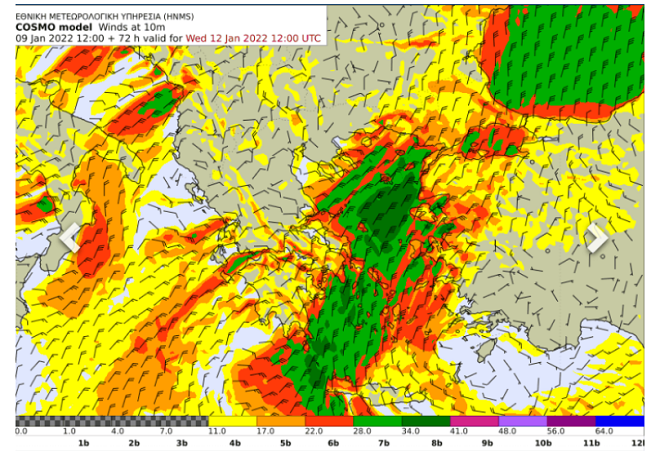 Πολύ θυελλώδεις βορειοανατολικοί άνεμοι θα πνέουν την Τρίτη (11-01-2022) στο βόρειο Αιγαίο και την Τετάρτη (12-01-2022) και την Πέμπτη (13-01-2022) στο μεγαλύτερο μέρος του Αιγαίου. Μικρή εξασθένηση των ανέμων αναμένεται από το βράδυ της Πέμπτης.