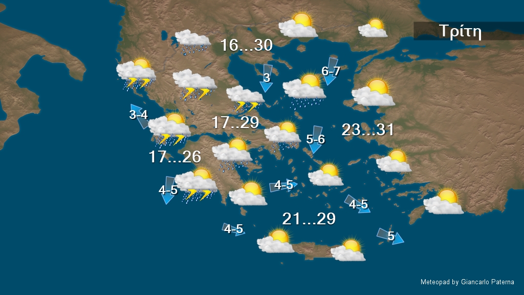 Νεφώσεις με τοπικές βροχές και σποραδικές καταιγίδες προβλέπονται στο μεγαλύτερο μέρος της χώρας. Τα φαινόμενα θα είναι κατά τόπους ισχυρά στο Ιόνιο, την κεντρική και νότια ηπειρωτική χώρα (στη Θεσσαλία, τη Στερεά και την Πελοπόννησο), τις Σποράδες, την Εύβοια, τη δυτική Κρήτη και πιθανώς τις δυτικές Κυκλάδες. Επισημαίνεται ότι τα μεγαλύτερα ύψη βροχής θα σημειωθούν στο νομό Καρδίτσας, στα ανατολικά τμήματα του νομού Μαγνησίας, στο νομό Φθιώτιδας, στις Σποράδες και στη βόρεια Εύβοια. Οι άνεμοι στα δυτικά θα πνέουν από ανατολικές διευθύνσεις 3 με 5 μποφόρ. Στα ανατολικά θα πνέουν από βόρειες διευθύνσεις 4 με 5 και στο βόρειο Αιγαίο βορειοανατολικοί πρόσκαιρα 6 με 7 μποφόρ, βαθμιαία όμως στα νότια πελάγη θα στραφούν σε νότιους ενώ στο βόρειο Αιγαίο από το βράδυ θα εξασθενήσουν. Η θερμοκρασία θα σημειώσει μικρή πτώση και θα φτάσει στα δυτικά τους 24 με 26 και στα ανατολικά τους 28 με 30 βαθμούς κελσίου.