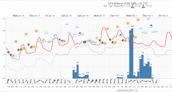 Στην αναλυτική πρόγνωση της ΕΜΥ περιγράφονται δύο σαφείς μεταβολές του καιρού για το επόμενο 7ημερο. Η πρώτη έρχεται το Σαββατοκύριακο και η επόμενη διαταραχή το διάστημα Τρίτης – Πέμπτης (1-3/2/2022).