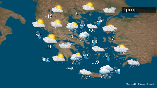 Στα δυτικά και τα βόρεια προβλέπονται λίγες νεφώσεις παροδικά αυξημένες με πρόσκαιρο χιονόνερο ή χιόνι. Στην υπόλοιπη χώρα προβλέπονται νεφώσεις με χιονόνερο και χιονοπτώσεις κατά τόπους πυκνές στα νότια τμήματα της Θεσσαλίας, τις Σποράδες, την Εύβοια, την ανατολική Στερεά, την ανατολική Πελοπόννησο, τις Κυκλάδες και την Κρήτη, όμως τα φαινόμενα από τις πρωινές ώρες και από τα βόρεια θα εξασθενήσουν και τη νύχτα στη Θεσσαλία και την ανατολική Πελοπόννησο αναμένεται να σταματήσουν. Οι άνεμοι θα πνέουν βορειοανατολικοί 5 με 7 και στο Αιγαίο 8 με 9 μποφόρ και από το μεσημέρι βόρειοι με μικρή εξασθένηση. Η θερμοκρασία θα διατηρηθεί σε πολύ χαμηλά επίπεδα. Οι μέγιστες τιμές της δεν θα ξεπεράσουν στα δυτικά και τα νησιά τους 8 με 10 βαθμούς και στα υπόλοιπα ηπειρωτικά τους 3 με 5 βαθμούς Κελσίου ενώ οι ελάχιστες θα πέσουν στα ηπειρωτικά στους -5 με -6, στα βορειοδυτικά στους -15 και στα νησιά στους 2 με 4 βαθμούς Κελσίου. Παγετός θα σημειωθεί στα ηπειρωτικά, ο οποίος θα είναι κατά τόπους ισχυρός ενώ στα βορειοδυτικά θα είναι ολικός.