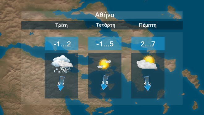 Στα δυτικά και τα βόρεια ηπειρωτικά γενικά αίθριος καιρός με τοπικές νεφώσεις από το απόγευμα στο Ιόνιο. Στην υπόλοιπη χώρα νεφώσεις παροδικά αυξημένες με χιονόνερο και χιονοπτώσεις κυρίως στην Εύβοια και στο νότιο Αιγαίο, οι οποίες μέχρι το βράδυ θα περιοριστούν στις νοτιότερες περιοχές. Οι άνεμοι θα πνέουν από βόρειες διευθύνσεις, στα δυτικά 4 με 6 μποφόρ, στα ανατολικά 5 με 7 και στα νοτιοανατολικά μέχρι το απόγευμα τοπικά 8 μποφόρ, με εξασθένηση την νύχτα από τα βορειοανατολικά. Η θερμοκρασία θα σημειώσει μικρή άνοδο ως προς τις μέγιστες τιμές της αν και οι ελάχιστες θα διατηρηθούν σε χαμηλά επίπεδα. Κατά τόπους στα ηπειρωτικά θα σημειωθεί ισχυρός παγετός τις πρωινές και τις βραδινές ώρες.