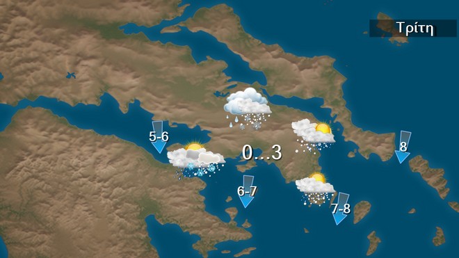 Σήμερα Τρίτη χιονοπτώσεις κατά τόπους πυκνές θα εκδηλωθούν στις Σποράδες, την Εύβοια, την ανατολική Θεσσαλία (κυρίως Μαγνησία), την ανατολική Στερεά, την ανατολική Πελοπόννησο, τις Κυκλάδες, την Κρήτη και τα νησιά του ανατολικού Αιγαίου που από το μεσημέρι και από τα βόρεια θα εξασθενήσουν.