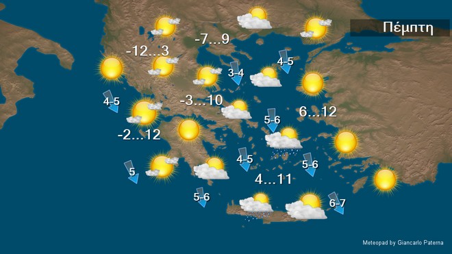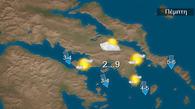Σήμερα Πέμπτη προβλέπεται γενικά αίθριος καιρός στις περισσότερες περιοχές της χώρας με λίγες νεφώσεις κατά τόπους αυξημένες κυρίως στο Αιγαίο. Ίσως λίγες βροχές κατά κανόνα ασθενείς σημειωθούν στα νησιά του Αιγαίου, την Κρήτη και την ανατολική Εύβοια. Στα ορεινά της Κρήτης, της Εύβοιας, της ανατολικής Μακεδονίας και της Θράκης θα πέσουν λίγα χιόνια. Οι άνεμοι θα πνέουν βόρειοι βορειοδυτικοί 4 με 6 και στα νοτιοανατολικά 5 με 7 μποφόρ, με εξασθένηση το βράδυ.