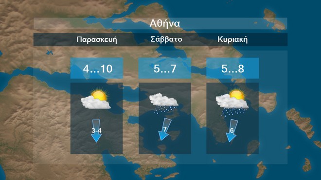 Στην Αθήνα θα έχουμε λίγες νεφώσεις έως την Παρασκευή αλλά το Σάββατο ο καιρός θα χαλάσει και θα έχουμε πολλές βροχές. Η θερμοκρασία θα έχει μέγιστες τιμές περί τους 8 με 10 βαθμούς Κελσίου.