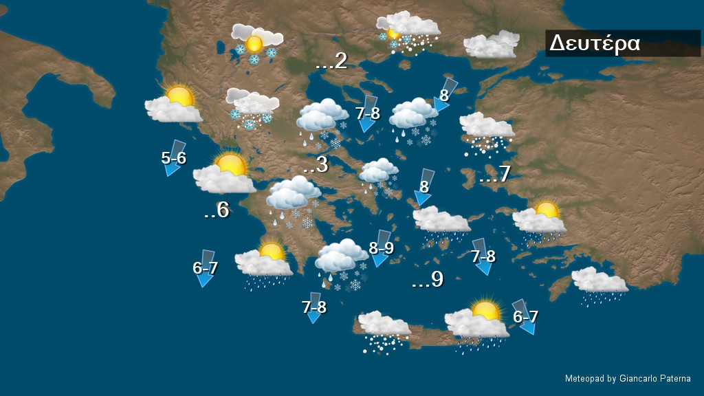 Στα δυτικά και τα βόρεια προβλέπονται τοπικές νεφώσεις με παροδικές χιονοπτώσεις ή χιονόνερο. Στην υπόλοιπη χώρα προβλέπεται κακοκαιρία με χιονοπτώσεις ή χιονόνερο και στα νοτιότερα θαλάσσια και παραθαλάσσια τμήματα βροχές. Οι χιονοπτώσεις θα είναι κατά τόπους πυκνές αρχικά στο κεντρικό και το βόρειο Αιγαίο, την Εύβοια, την ανατολική Θεσσαλία, την ανατολική Στερεά και βαθμιαία στην ανατολική Πελοπόννησο και όλο το νότιο Αιγαίο μέχρι την Κρήτη και τα Δωδεκάνησα. Οι άνεμοι θα πνέουν βόρειοι βορειοανατολικοί 5 με 7 και βαθμιαία στα ανατολικά ηπειρωτικά και στο Αιγαίο 8 με 9 μποφόρ και μόνο στα Δωδεκάνησα θα είναι νότιοι νοτιοανατολικοί 5 με 7 μποφόρ. Η θερμοκρασία θα διατηρηθεί σε πολύ χαμηλά επίπεδα. Παγετός θα σημειωθεί κυρίως στα ηπειρωτικά, ο οποίος θα είναι κατά τόπους ισχυρός και σε πολλές περιοχές της κεντρικής και βόρειας ηπειρωτικής χώρας ολικός.